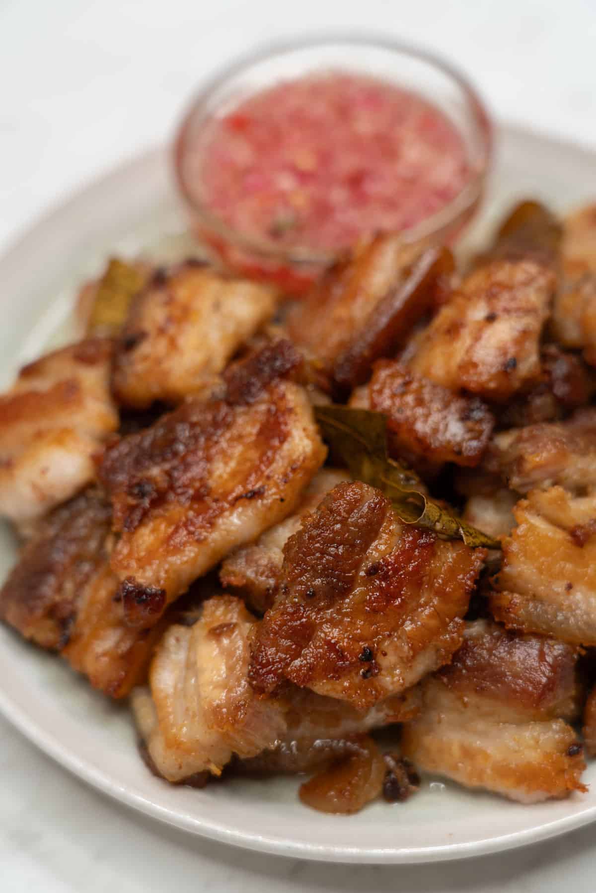 Pork is cooked with garlic, salt, black pepper, and vinegar until it's tender and lightly browned.