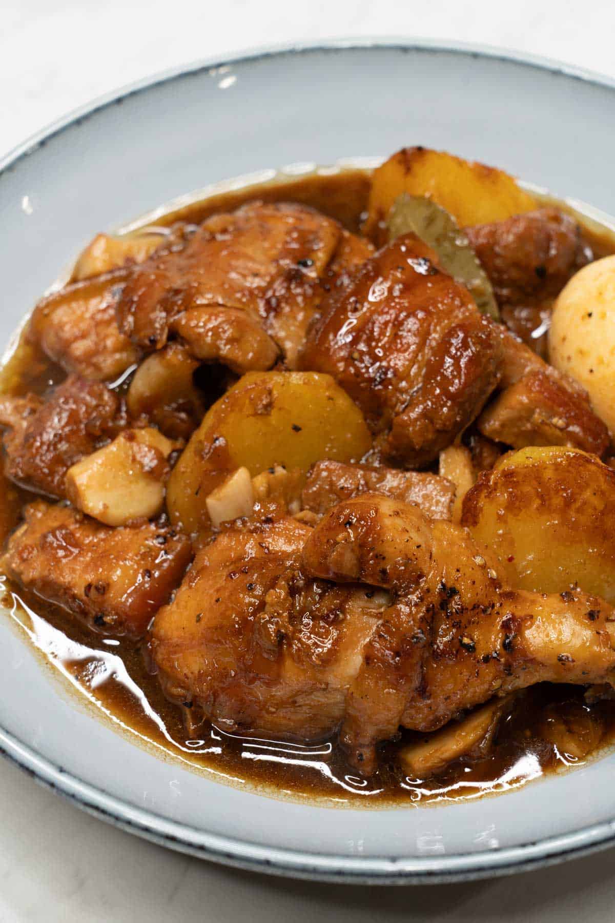 This chicken and pork adobo with potatoes and eggs is a heartier version of adobo that's more of a full meal in one pot.