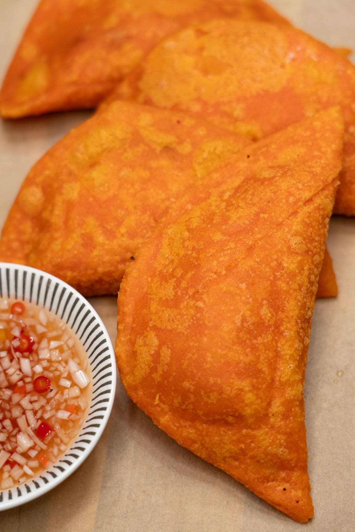 That crispy shell is what makes it so special. Each empanada is fried until crisp and served with sukang Iloko.
