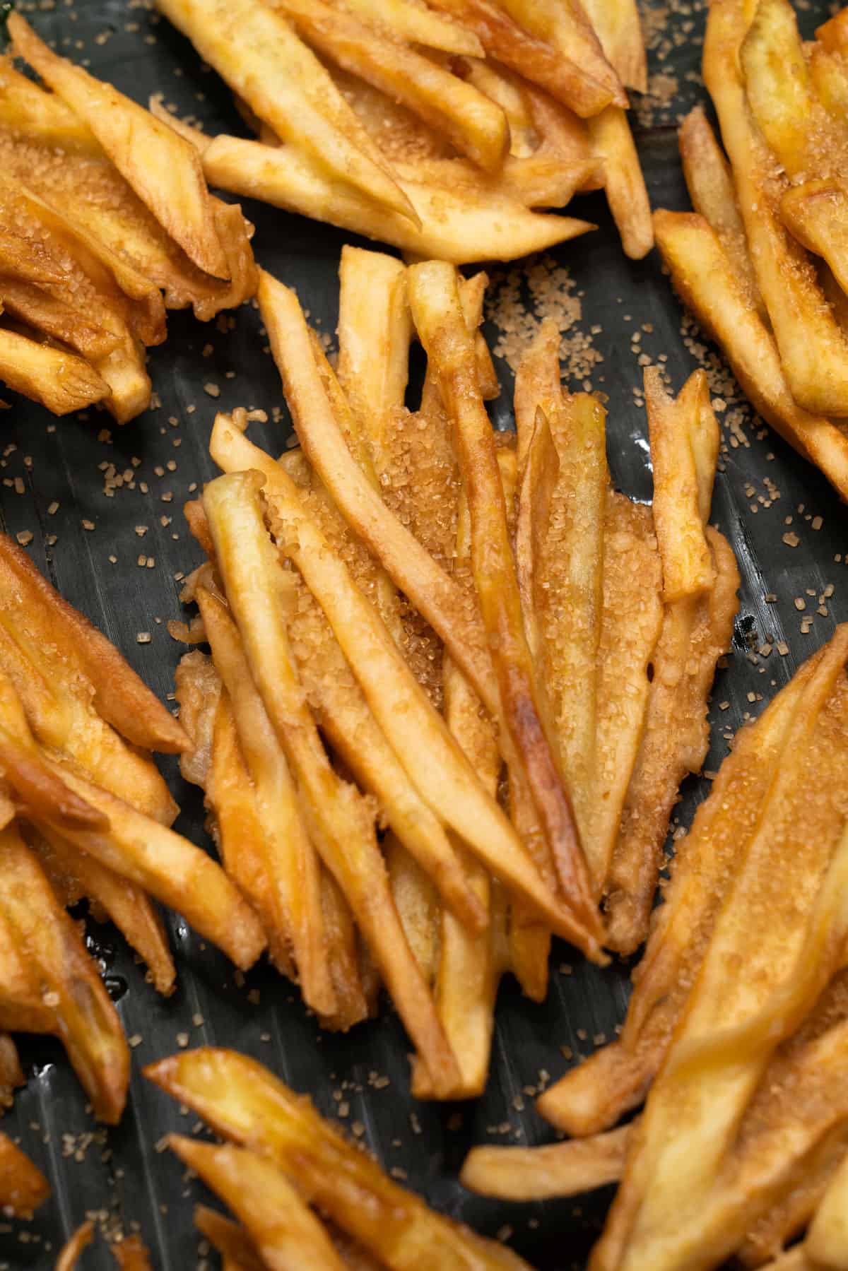 Transfer the fried sweet potatoes to a plate lined with paper towels. Let the excess oil drain off.