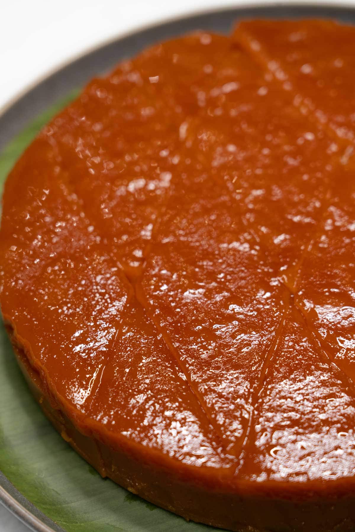 This traditional kutsinta is made in a pan instead of the usual small molds. It has two layers with slightly different textures - a firmer, chewy bottom layer and a softer top layer.